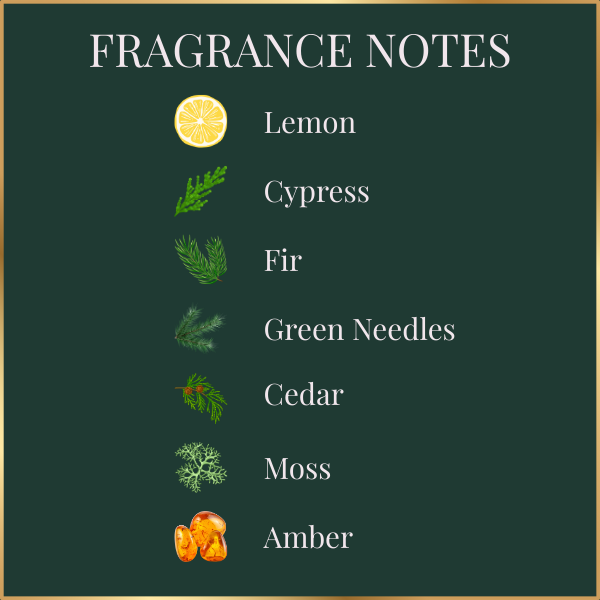Fraser Fir scent fills your space with a fresh blend of cypress, lemon, green needles, cedar, fir, amber, and moss. It’s crisp, bright, and woodsy — like stepping into a snowy forest or bringing home the perfect Christmas tree for the season .